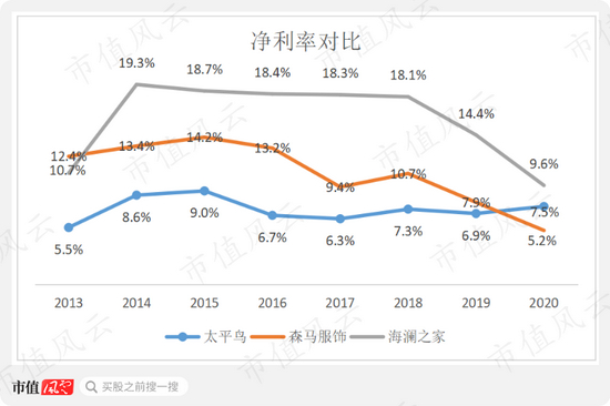 但太平鸟毛利率最高的情况下,净利率却垫底,一直在10%以下。