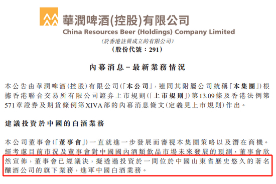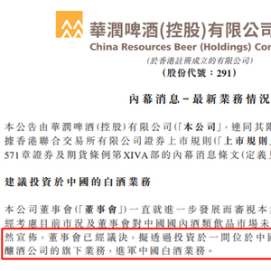 8月26日,华润啤酒发布公告,经考虑目前市况及董事会对中国国内酒类饮品市场未来发展的预测,董事会已经议决,拟通过投资一间位于中国山东省历史悠久的着名酿酒公司的旗下业务,进军白酒业务。
