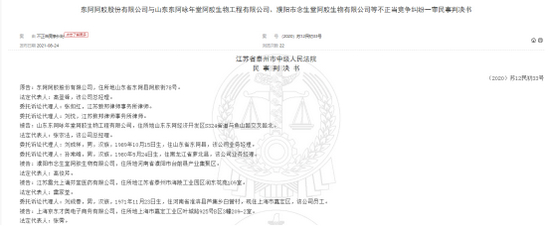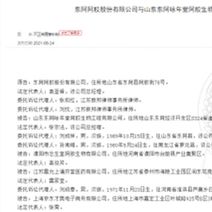 8月24日,东阿阿胶股份有限公司与山东东阿咏年堂阿胶生物工程有限公司、濮阳市念生堂阿胶生物有限公司等不正当竞争纠纷的一审民事判决书在中国裁判文书网公开。