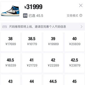 中证君在该交易平台上搜索“闪电倒钩”发现,以高帮为例,尺码由38到48.5,最贵的是45.5码,售价31999元,其他如45码售价29989元、48.5码售价27479元等,最便宜的38.5码,售价也要16179元。