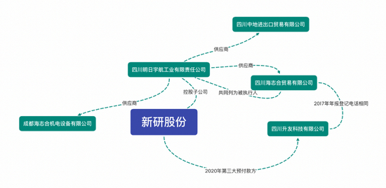 据新研股份年报问询函回复披露,三家供应商中,四川中地为代理人,真正提供货物的是北京航兴盛经贸有限公司(以下简称北京航兴盛)。