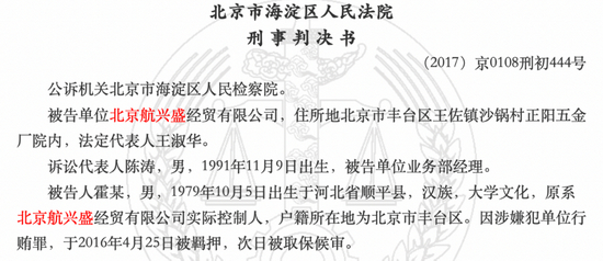 两家公司还存在股东和高级管理人员重名的情况。“陈涛”为北京海源的现任股东,认缴出资额对应的持股比例是3%。根据2017年5月23日北京市海淀区人民法院披露的一份刑事判决书,“陈涛”也曾是北京航兴盛的业务部经理。刑事判决书显示,2016年4月25日,北京航兴盛实际控制人霍某(刑事判决书显示为“北京航兴盛经贸有限公司实际负责人”)因涉嫌单位行贿罪被羁押,被告单位为北京航兴盛。当时,“陈涛”作为北京航兴盛的业务部经理,也是北京航兴盛的诉讼代表人。