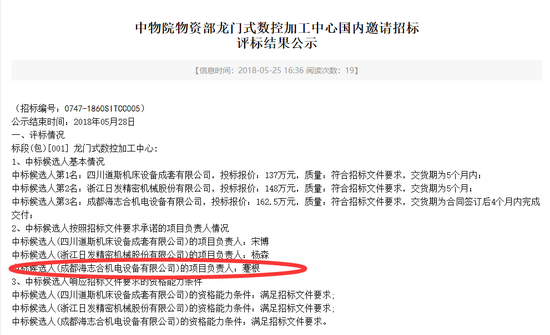 《每日经济新闻》记者多方查阅资料发现,根据2018年中国工程物理研究院(以下简称中物院)物资部龙门式数控加工中心国内邀请招标评标结果公示,中标候选人成都海志合的项目负责人是“蹇根”。