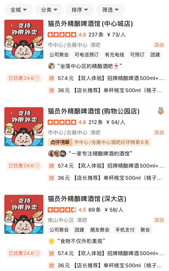 值得一提的是,在海伦司通过港交所聆讯当日,连锁酒馆品牌“猫员外”宣布完成总额过亿元的Pre-A及A轮融资。与海伦司类似,猫员外提供精酿啤酒、佐酒小吃,均为全部自研自供,人均消费在50-70元区间,目前店铺主要集中在深圳。
