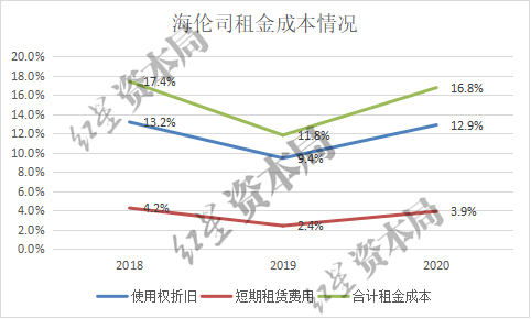 海伦司合计租金由使用权折旧和短期租赁费用组成。根据招股说明书,总租赁成本占比由2018年17.40%下降到2019年11.81%。2020年占比有所增加,上升到16.75%。