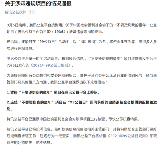 腾讯公益平台第一时间启动调查。根据投诉信息,“不要烫伤我的童年”项目涉嫌违反平台于7月5日发布的《2021年99公益日规则》。