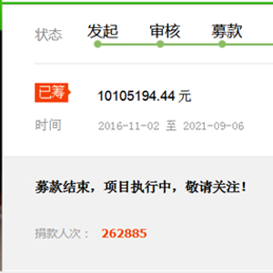 记者查询显示,该项目自2016年11月2日至2021年9月6日已筹资金1010.52万元,目前处于募款结束,项目执行中状态。
