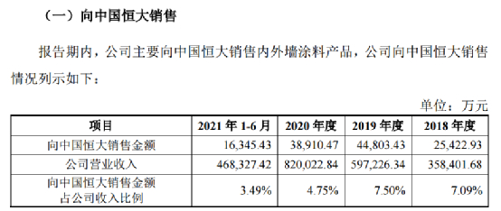 而恒大则连续四年成为三棵树的第一大客户。2018年至2021年三年一期分别产生销售额 2.54亿元、4.48亿元、3.89亿元和1.63亿元,合计金额12.54亿元,各期销售收入占其营业收入比例分别为 7.09%、7.50%、4.75%和 3.49%,占比保持下降趋势。三棵树称,考虑到中国恒大目前的资金状况,公司对其未来的销售规模可能会进一步下降,随着国内对房地产调控的加强可能对公司业绩产生一定影响。