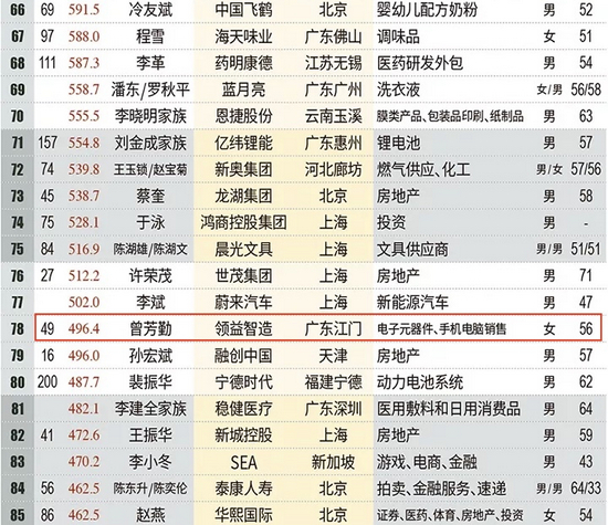 水涨船高,作为领益智造掌舵者,曾芳勤身家也在上涨。在最新公布的《2021新财富500富人榜》上,曾芳勤以496亿元的财富上榜。