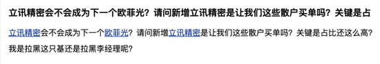 但公司的回应并没有打消投资者的疑虑,有投资者在股吧仍对此表示担忧,如裁员风波,是否涉及订单量的变化,立讯精密是否会被踢出果链。