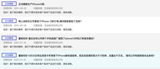 对于即将发布的iPhone 13新品,立讯精密是否将冲击富士康地位进行代工等热门话题,立讯精密并未正面回应。其表示“基于契约精神,不便对具体客户具体产品进行说明”。