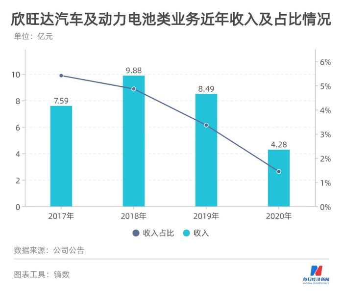 数据披露,欣旺达2017~2020年汽车及动力电池类收入分别是7.59亿元、9.88亿元、8.49亿元及4.28亿元,收入占比分别是5.41%、4.86%、3.36%及1.44%。
