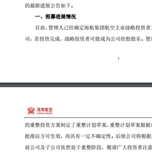 财联社9月12日讯,海航集团重组事宜终于迎来实质性进展,旗下两大业务板块(航空,机场)的两家上市公司海航控股,海航基础齐发公告,公布战略投资者招募进展。