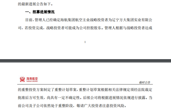 *ST海航公告称,目前,管理人已经确定海航集团航空主业战略投资者为辽宁方大集团实业有限公司,若投资完成,战略投资者可能成为公司控股股东。