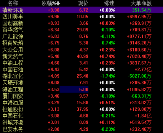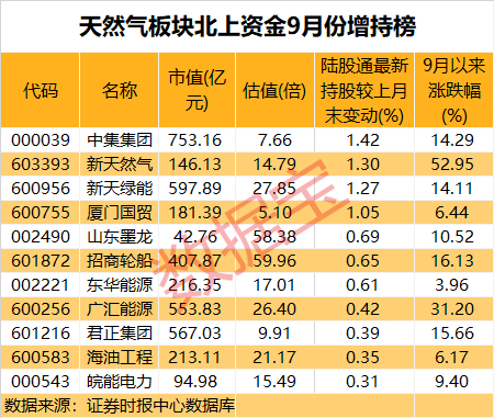 天然气板块北上资金9月增持榜出炉。