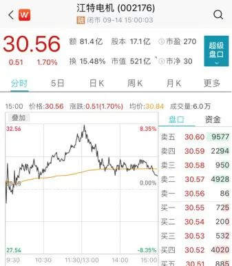9月14日,江特电机收于30.56元,上涨1.7%。至此,江特电机股价在过去一年间累计上涨1428%,位列A股第一名。