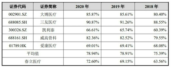 春立医疗招股书显示,2018年、2019年及2020年其综合毛利率分别为63.56%、69.15%及72.60%。爱康医疗与春立医疗的业务结构最为相近,其综合毛利率分别为68.08%、69.41%及69.01%,与公司报告期内的毛利率水平基本一致。春立医疗表示,其综合毛利率略低于大博医疗、三友医疗、威高骨科,略高于凯利泰,主要系产品结构差异所致。