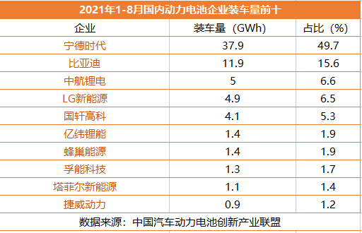 国内动力电池市场格局已经基本形成,头部效应非常明显。据中国汽车动力电池产业创新联盟数据,1-8月国内动力电池企业装车量前5名分别为宁德时代、比亚迪、中航锂电、LG新能源、国轩高科,其中宁德时代占比过半,前5家合计市场份额超83%。