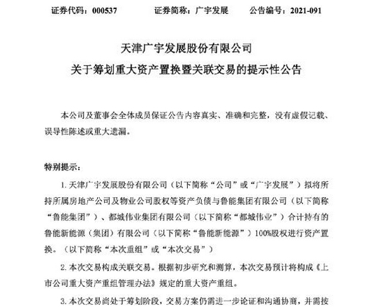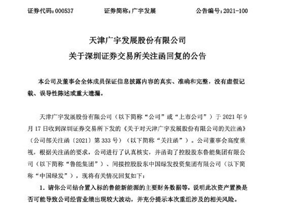 9月17日,深交所对广宇发展下发关注函。要求公司结合置入标的鲁能新能源的主要财务数据等,说明此次资产置换是否可能导致公司经营业绩出现较大波动,并充分提示本次重组涉及的相关风险;是否存在应披露而未披露的重大信息,基本面是否发生重大变化等。