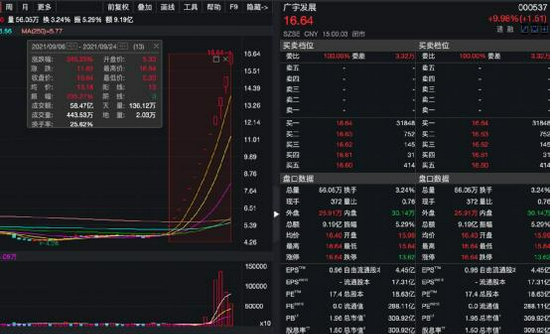 据了解,截至9月24日收盘,广宇发展已经累计实现13连板,成为当前市场连板最高的个股。近一个月以来,广宇发展已经累计大涨254%,市值累计暴增223亿。