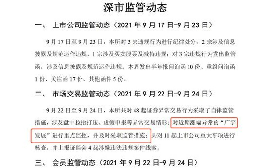9月24日晚间,深交所发布监管动态,其中提及对近期涨幅异常的“广宇发展”进行重点监控,并及时采取监管措施。