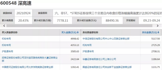 在连续三个涨停后,深高速于9月24日登上龙虎榜。龙虎榜显示,深高速9月24日买入与卖出的前五名,均出现了机构专用账户、沪股通专用账户,以及多家知名券商营业部。