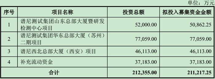 其中,此次定增预计募资额中,该公司将拿出50862.25万元用于谱尼测试集团山东总部大厦暨研发检测中心项目(简称“山东项目”),77059万元用于谱尼测试集团华东总部大厦(苏州)二期项目(简称“华东项目”),46113万元用于谱尼西北总部大厦(西安)项目(简称“西北项目”)以及37183万元用于补充流动资金。
