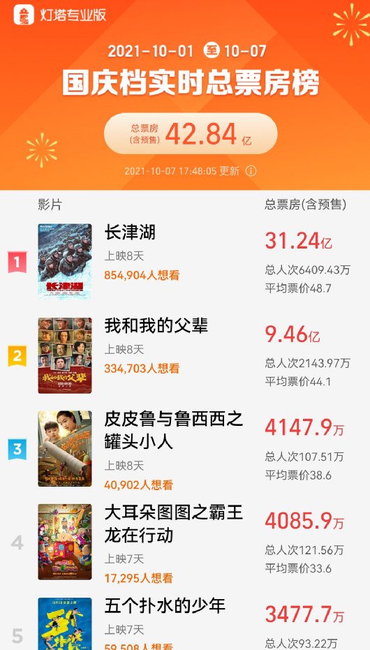 根据灯塔专业版数据,截至10月7日晚间17点左右,国庆档实时总票房(含预售)已经达到42.84亿,已超过2020年国庆档总票房。这也是国庆档历史第二次破40亿,据国家电影专项资金办公室数据显示,2019年国庆档票房超43.57亿元。