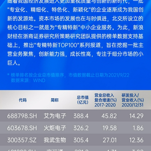 引言:随着我国经济发展进入更加重视质量与创新的新时代,一批“专业化、精细化、特色化、新颖化”的企业逐渐成为我国创新的发源地。资本市场的发展也在与时俱进,北交所设立的核心目标之一就是为“专精特新”中小企业服务。为此,新浪财经推出“专精特新TOP100”系列报道,旨在挖掘一批主营业务聚焦,创新能力强,成长性高,专注于细分市场的小巨人。