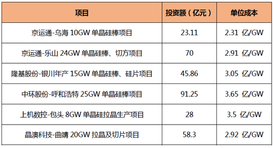 相较而言,隆基股份今年3月在银川投资31亿元建设年产5GW的电池项目,单GW总成本达到了6亿元。隆基2019年10月的15GW硅棒和硅片项目,单GW投入成本3.06亿元,上机数控包头8GW单晶硅项目,单GW投入成本3.5亿元。