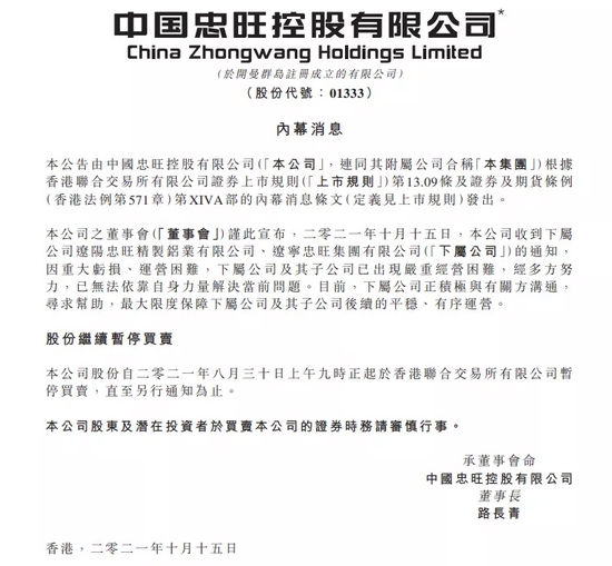 公告显示,2021年10月15日,公司收到下属公司辽阳忠旺精制铝业有限公司、辽宁忠旺集团有限公司的通知,因重大亏损、运营困难,下属公司及其子公司已出现严重经营困难,经多方努力,已无法依靠自身力量解决当前问题。目前,下属公司正积极与有关方沟通,寻求帮助,最大限度保障下属公司及其子公司后续的平稳、有序运营。与此同时,中国忠旺继续停牌,直至另行通知为止。