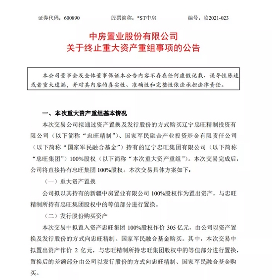 8月11日晚间,*ST中房公告称,鉴于目前市场环境等原因,经交易各方协定,决定终止本次重大资产重组。按原计划,公司将通过资产置换及发行股份的方式,购买忠旺集团100%股权(中国忠旺持股达96.55%的子公司),作价305亿元。重组完成后,忠旺集团实控人刘忠田将成为*ST中房新的实控人。