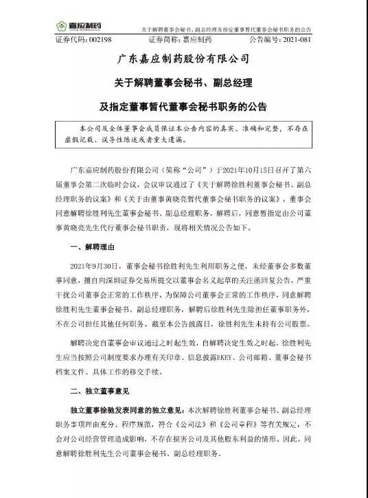 10月18日晚间,嘉应制药(002198.SZ)披露公告称,经董事会临时会议决议,公司已于10月15日解聘徐胜利的董事会秘书、副总经理职务。