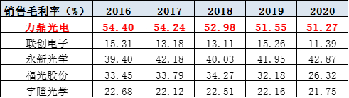 作为一个“小而精”的光学镜头制造商,力鼎光电盈利实力强劲,销售毛利率维稳50%+,远远超过同行业可比公司的毛利率水平。
