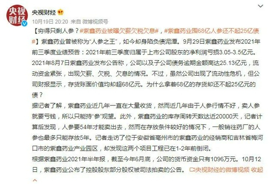 10月20日,#紫鑫药业囤68亿人参还不起25亿债#冲上微博热搜,“穷得只剩人参?”引发热议。