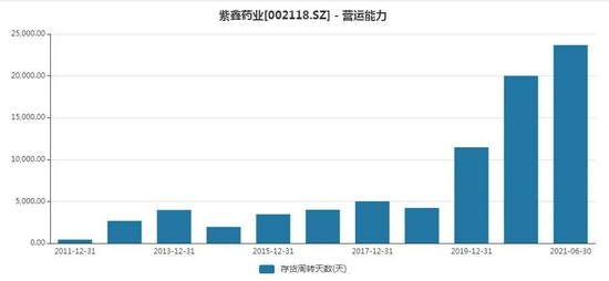 超高的存货加上下滑的收入,导致紫鑫药业存货周转天数大幅抬升。今年上半年,紫鑫药业的存货周转天数已经高达23684.21天。