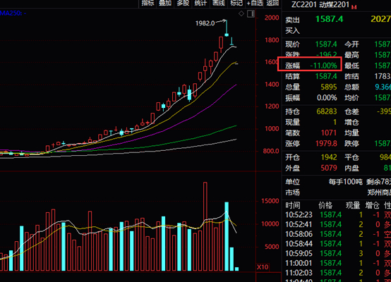 行情数据显示,今天上午动力煤期货连续第二个交易日跌停,主力合约(ZC2201)跌幅达到11%。