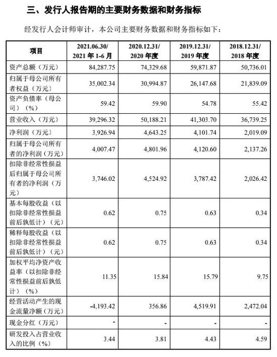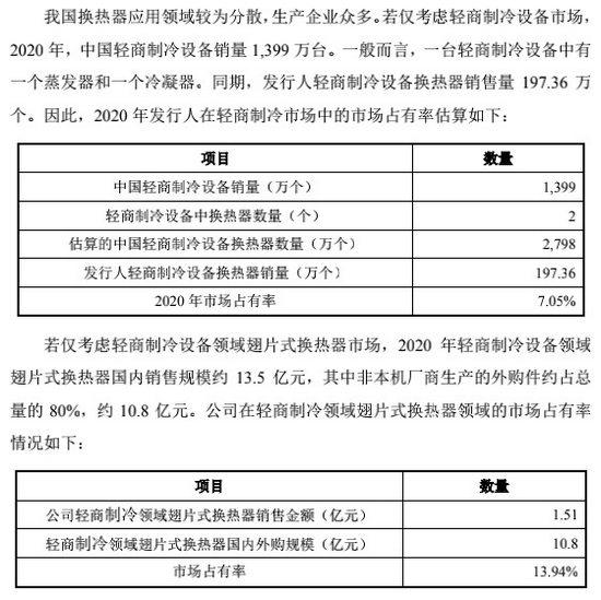 公司在招股书中表示,我国换热器应用领域较为分散,生产企业众多。若仅考虑轻商制冷设备市场,2020年,中国轻商制冷设备销量1399万台。一般而言,一台轻商制冷设备中有一个蒸发器和一个冷凝器。同期,发行人轻商制冷设备换热器销售量197.36万个。按此计算,2020年发行人在轻商制冷市场中的市场占有率为7.05%。