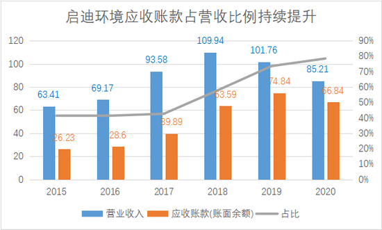 关于经营业绩,自2015年以来,启迪环境的营业收入经历快速增长之后,于2019年开始步入下降通道。与收入增长趋势相同的,是应收账款的快速增长。其应收账款占营业收入的比例逐年提升,2015年为40%,到2020年时已经接近80%。