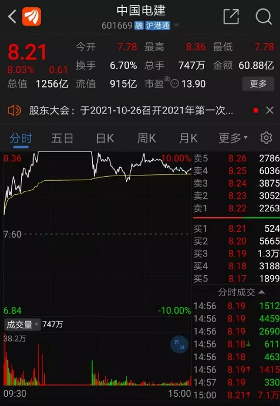 周一大涨5%的储能板块今日高开回落,但千亿电建巨头中国电建早盘高开高走,继续冲击涨停,收盘涨幅也达8%,两日累计大涨19%。