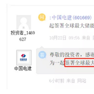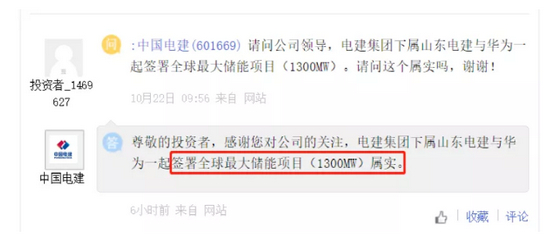 10月22日,有投资者在中国电建投资者互动平台提问:电建集团下属山东电建与华为一起签署全球最大储能项目(1300MW),请问这个属实吗?10月26日10时左右,中国电建回复确认了这一消息。