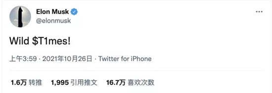 在另一条推特上,马斯克感叹:“疯狂的万亿时刻”。