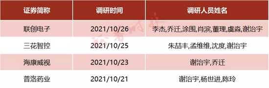 在接到任命通知后,记者注意到,谢治宇10月下旬以来接连出面调研,目前已经出现在了普洛药业、海康威视、三花智控、联创电子等多家上市公司调研名单中。其中,在海康威视、连创电子等调研方面,谢治宇更是频繁露面。