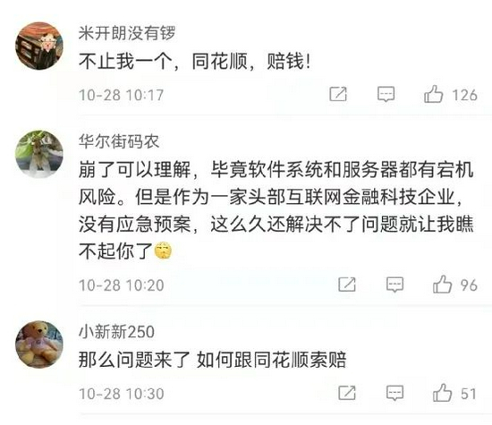 尽管在上午收盘前,同花顺系统已经恢复并道歉,但网友仍不买账,纷纷喊着要同花顺赔钱。“赔钱”“可以索赔吗?早盘拉高的票卖不出去,这会被闷下来了”“如何向同花顺索赔”……