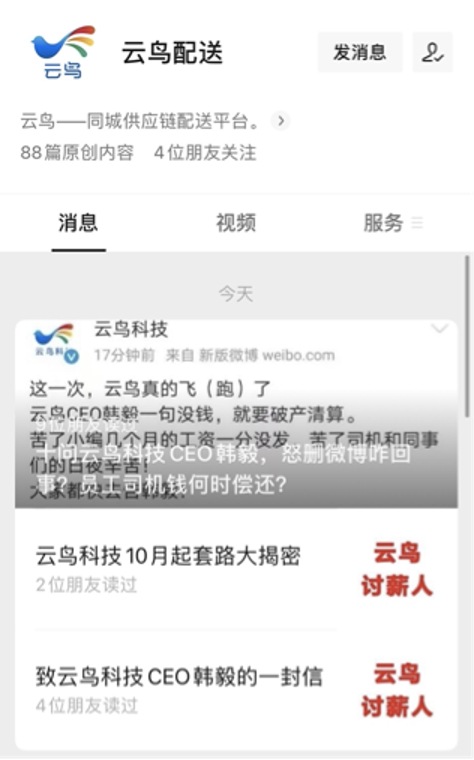 11月2日,云鸟科技员工们“转战”微信公众号,继续声讨韩毅,同时在微博上,有大量云鸟员工和平台司机发声:“近三千名员工三个月没有拿到工资,上万名司机上亿押金运费未结算”。