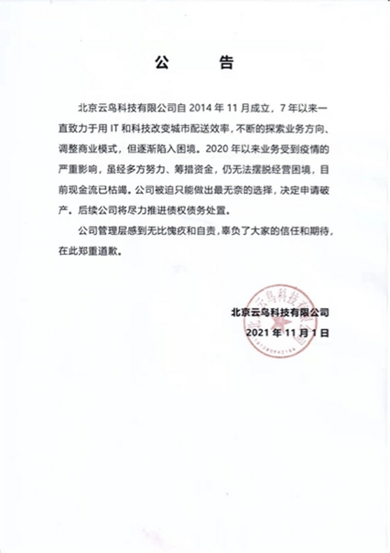 但到了10月30日发薪日,员工们却听到了公司要宣布破产的流言;11月1日,员工们收到公司内部公告,云鸟在公告中称公司2020年以来业务受疫情影响,目前现金流已枯竭,决定申请破产。同时,钉钉员工群也全部解散。