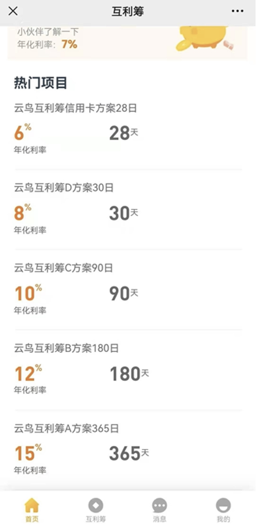 在苹果和安卓应用商店中,记者均未搜到互利筹APP,在互联网上也未搜到互利筹的公开官网。李青告诉记者,关于互利筹,公司给员工的解释是理财产品,给员工发送的是内部链接。根据员工所提供的截图,互利筹提供的项目的确市面上的理财产品类似,有年化利率和产品期限,但是与支付宝、银行等机构的理财产品不同的是,互利筹理财产品的年化利率明显高很多。