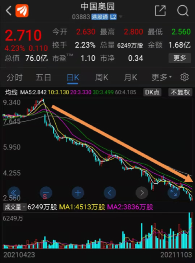 6月初以来,中国奥园股价就一直跌跌不休,从9.12元的高位跌至11月3日收盘仅有2.71元,五个月时间跌去70%,市值仅剩76亿港元。业内人士指,公司在股价如此低位仍不惜稀释股权来融资,足见流动性之紧张。