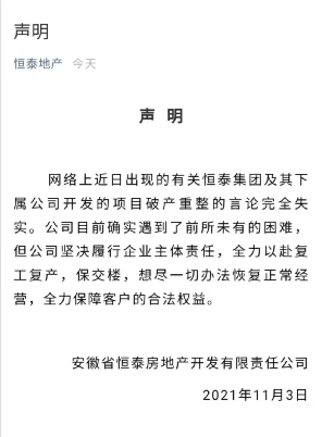 11月3日,安徽省恒泰房地产开发有限责任公司发布声明表示,网络上近日出现的有关恒泰集团及其下属公司开发的项目破产重整的言论完全失实。