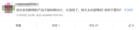 11月3日下午,有不少网友在社交平台爆料称,佳兆业集团(01638.HK)理财产品到期,却无法如期兑付。